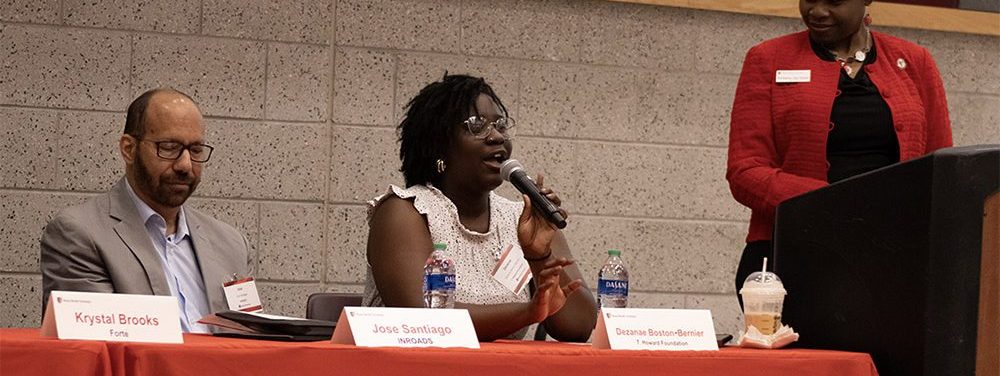 After introductions, the discussion began with MLT Recruitment and Admissions Manager Bedilia Ramirez, Forté Director of Development Krystal Brooks, Emma Bowen Foundation’s Dean of Student Affairs and Talent Acquisition Manager Claribel Nunez, T. Howard Associate Manager Dezanae Boston-Bernier, and INROADS Senior Manager Jose E. Santiago.